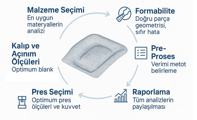 “Fizibilite ve formabilite analizleri, sac metal şekillendirme sürecinin başarısını önceden öngörmeyi sağlar. Doğru mühendislik yaklaşımıyla riskler minimize edilir, üretim güvenliği artırılır.”