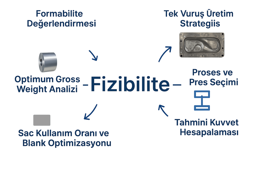 Sac metal şekillendirme projelerinde başarının ilk ve en kritik adımı fizibilite analizidir. Bu analiz, teklif aşamasında referans parçaların üretilebilirliğini, mühendislik uygunluğunu ve ekonomik fizibilitesini detaylı şekilde değerlendirerek projenin teknik temelini oluşturur. Üretime geçmeden önce yapılan fizibilite; yalnızca parça formunun uygunluğunu değil, aynı zamanda malzeme davranışlarını, proses senaryolarını ve potansiyel riskleri kapsar.